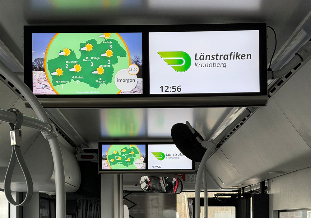 Med annonsering via infotainment på bussar i Kronobergstrafiken når du resenärer under hela deras resa – i en miljö där uppmärksamheten är hög och störningsmomenten få. Skärmarna ombord visar löpande trafikinformation och kompletteras med reklam, nyheter och väder. Denna kombination av nytta och underhållning skapar en naturlig plats för ditt budskap – och ger en positiv upplevelse som både engagerar och uppmärksammas. Här är ett effektivt och modernt sätt att nå din målgrupp, samtidigt som du bidrar till en mer inspirerande resa.